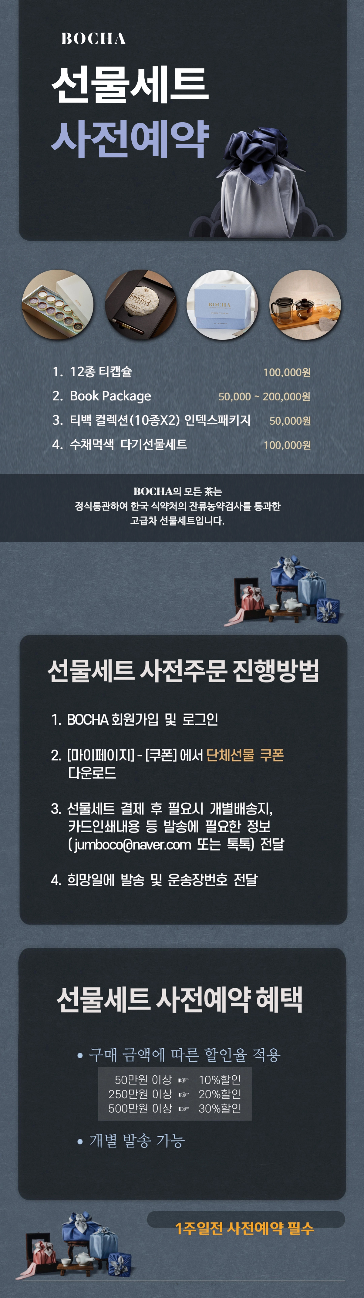 선물세트 사전예약 주문은 BOCHA 회원가입 => 로그인 후 마이페이지에서 쿠폰을 발행받아 원하는 상품 결제페이지에서 결제하시면 됩니다.