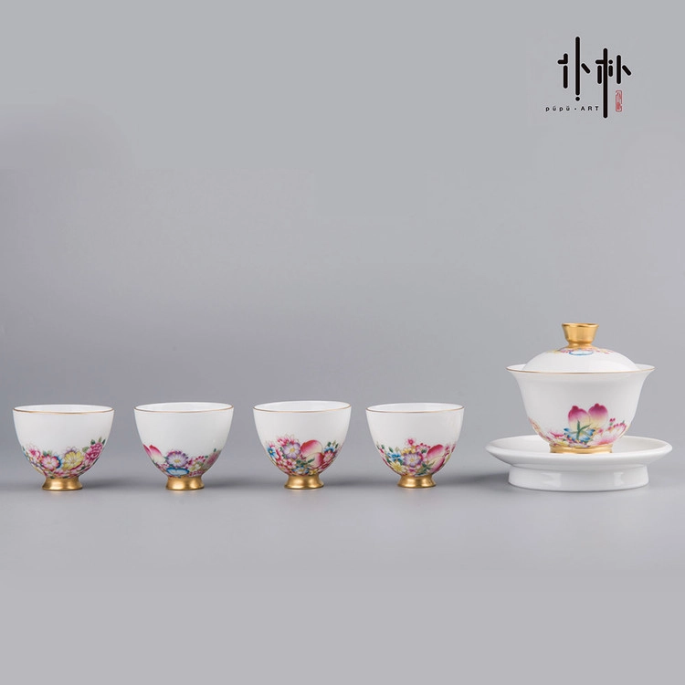 중국 G20 정상 만찬 공식 다기로 선정된 명품 도자 브랜드 Pupu의 18k 반꽃무늬 다기세트입니다. 깔끔하고 우아한 흰색 도자 바탕에 잔에서 피어나듯 솟아오르는 다채로운 색감의 아름답고 화사한 꽃송이들이 예술적 가치를 더합니다. 다구 전체를 채우는 온꽃이 아닌 반꽃 디자인으로 절제된 화려함을 극대화하고, 18K 금으로 고급스럽고 격조높은 가치를 담았습니다.