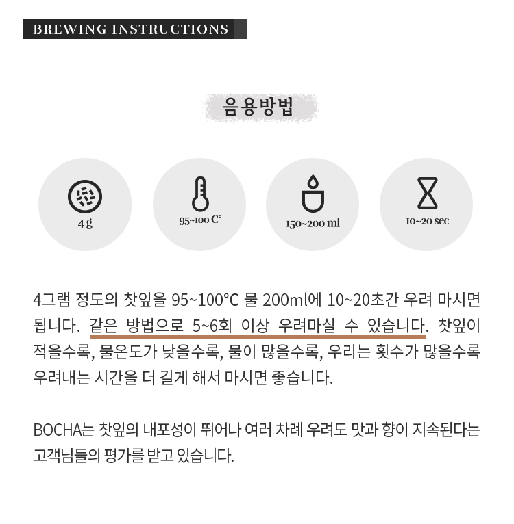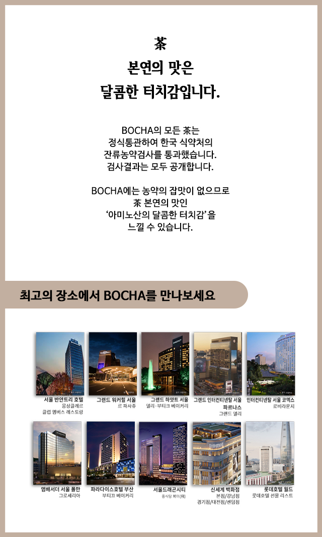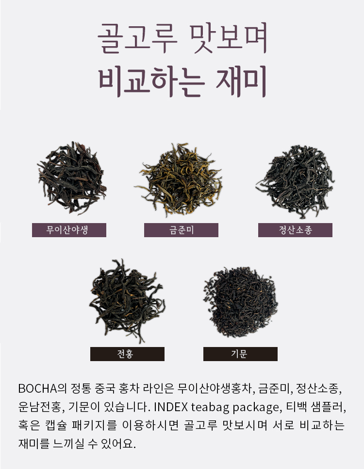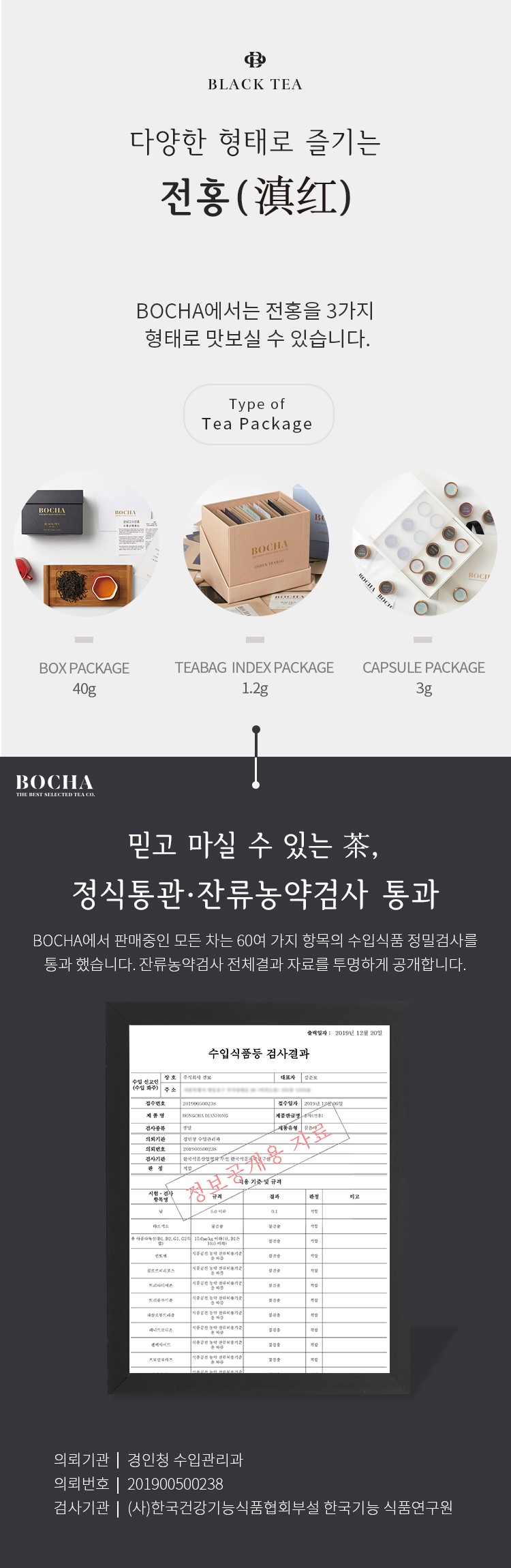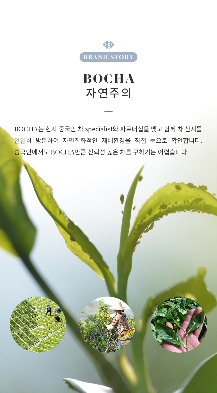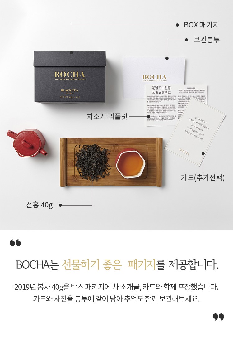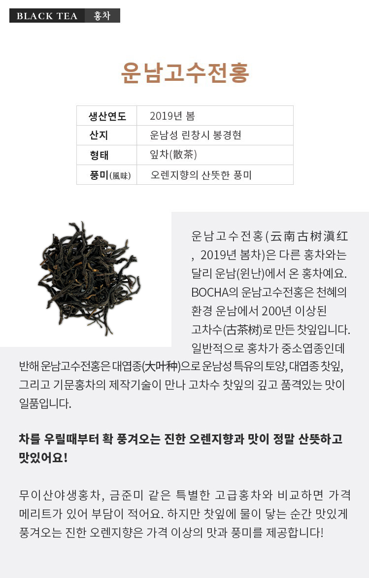 (2019년 봄찻잎) 천혜의 환경 운남(윈난)에서 200년 이상된 나무, 고차수(古茶树)로 만든 찻잎입니다. 다른 홍차와 달리 운남의 홍차는 특유의 토양환경으로 차별적인 풍미를 자랑하죠. 특히 BOCHA의 운남전홍은 최상급 고차수 찻잎의 깊고 품격있는 맛이 일품입니다. 차를 우릴때부터 확 풍겨오는 진한 오렌지향과 부드러운 달콤함이 정말 산뜻하고 "맛"있어요!