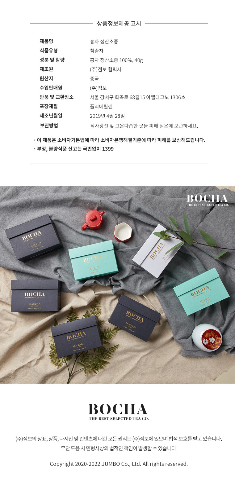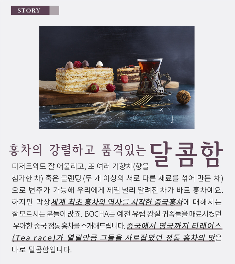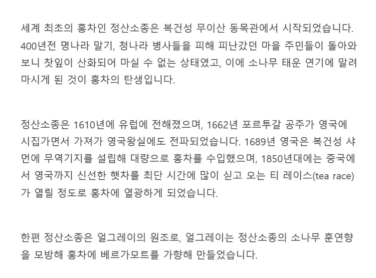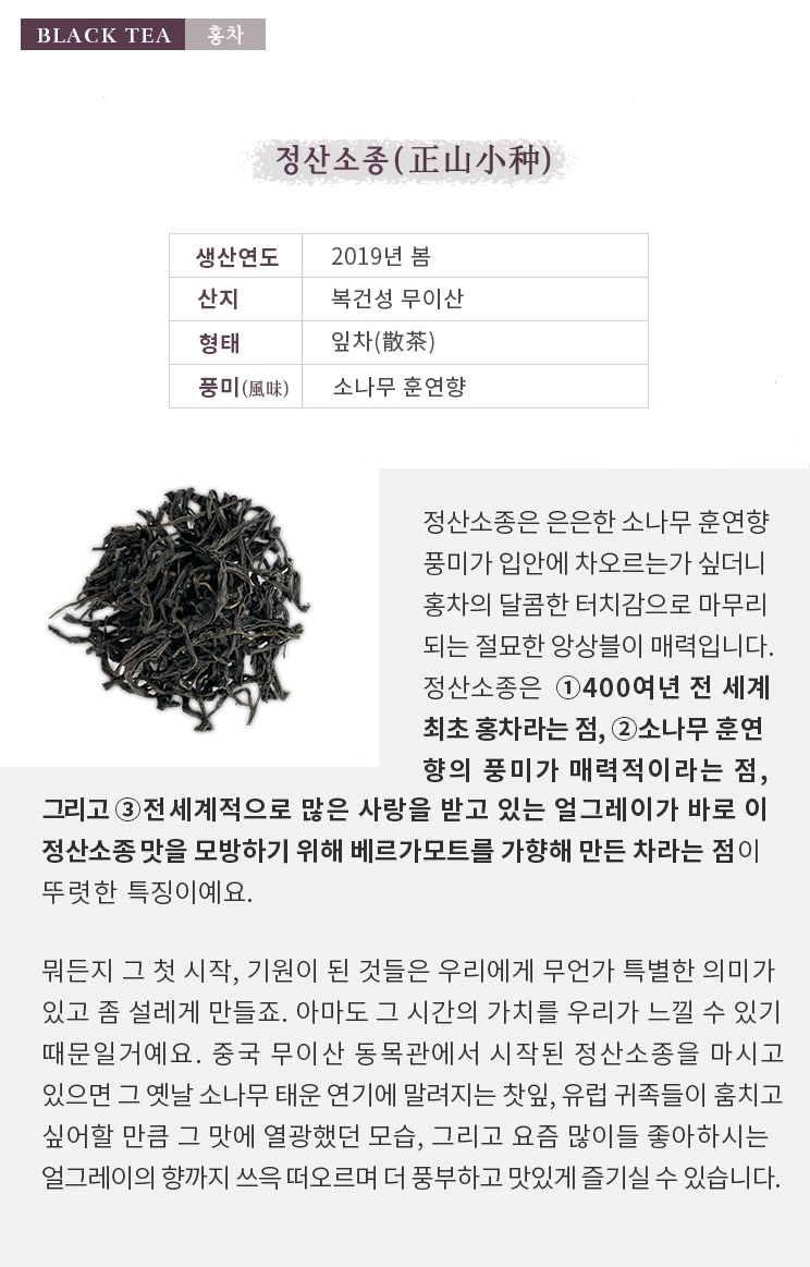 (2019년 봄찻잎) 400여년전 중국 무이산에서 처음 만들어진 정산소종이 바로 세계적으로 홍차의 첫 시작입니다. 19세기 티레이스(tea race)를 벌이고 여러 굵직한 역사적 전쟁의 시발점이 될만큼 유럽 귀족들을 매료시켰던 그 차로 은은한 소나무 훈연항 + 품격있는 달콤함의 앙상블이 정말 매력적입니다. 마치 지금의 반도체 기술처럼 중국이 홍차 제조 과정 유출을 꽁꽁 막자 결국 인위적인 베르가못향을 덧입혀 정산소종의 맛을 모방해 만들어낸 차가 바로 얼그레이예요. BOCHA의 최상급 찻잎으로 홍차의 원조를 만나보시기 바랍니다.